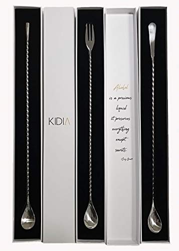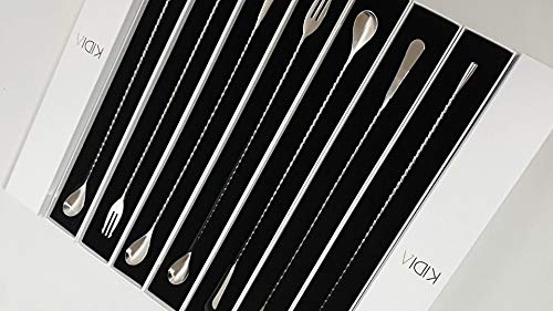 ????【STYLE】: Kidia bar spoon is made of top quality polished stainless steel, which is dishwasher safe. It is light but at the same time sturdy and perfectly balanced with a length of 40 cm. The model is stylish with the classic mixer spoon, the spiral handle and the drop-shaped end. It is properly presented, and with a sleek and minimalist packaging you can always carry it around with you from one workplace to another.