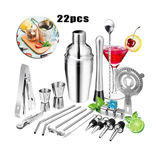【22-delige cocktailshakerset】 Onze cocktailshakerset bestaat uit: 1 * 550 ml cocktailshaker, 1 * Whiskey Stones Tang, 1 * Stroborstel, 1 * Menglepel, 1 * Muddlers, 2 * Rechte rietjes, 2 * Gebogen rietjes, 1 * IJstang, 4 * whiskystenen, 1 * flesopener, 2 * flessenstopper, 2 * wijnschenktangen, 1 * staafzeefjes, 2 * jiggers. Deze set is perfect voor beginners en ervaren barmannen, u kunt uw professionele en heerlijke cocktaildrankjes maken, zelfs in uw thuisbar.